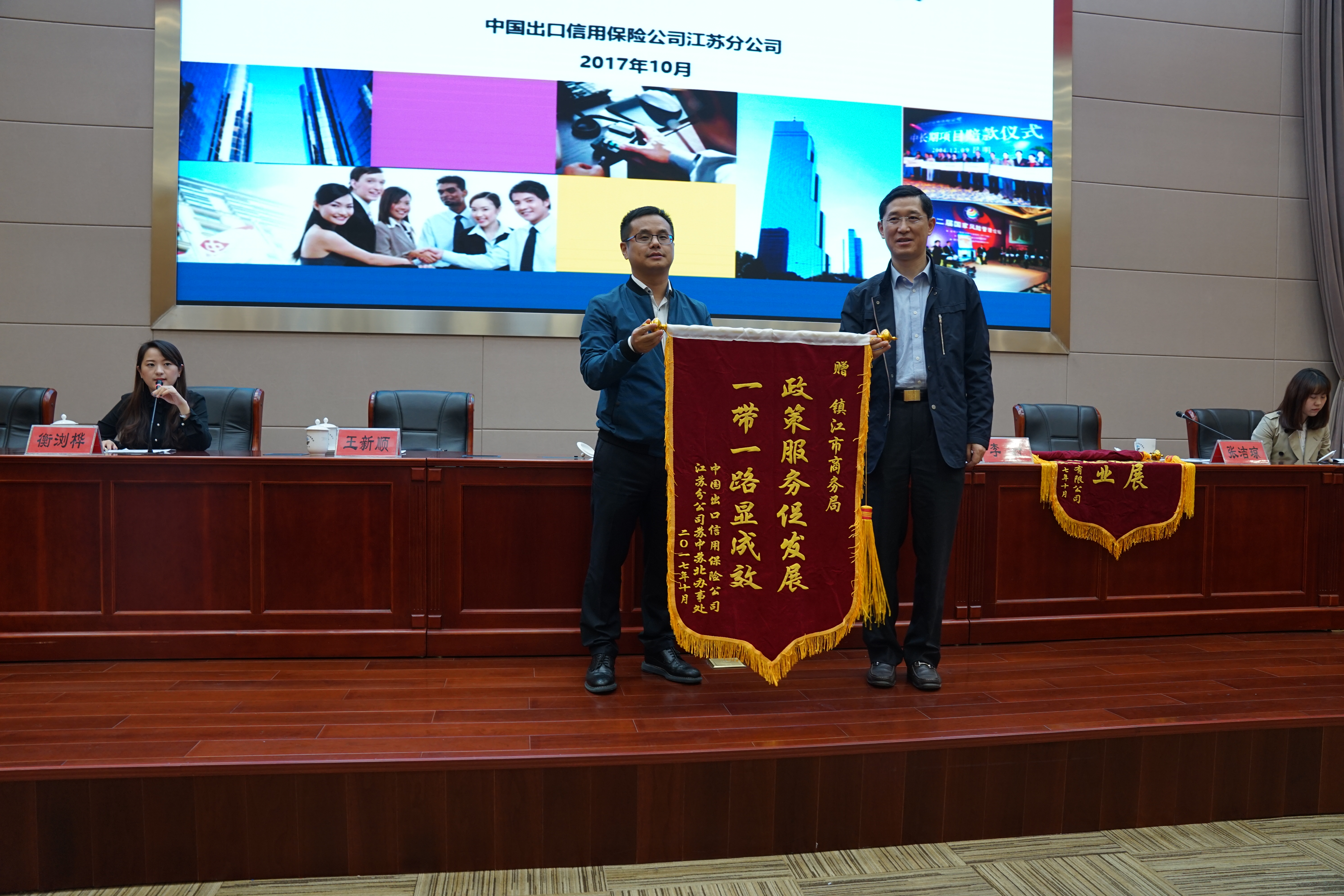 这些成绩的取得与社会各界的努力是分不开的,为感谢商务局一直以来对外贸工作的大力支持,企业代表江苏泛华进出口有限公司王小俊总经理和中国信保王新顺主任分别向商务局赠送了锦旗。